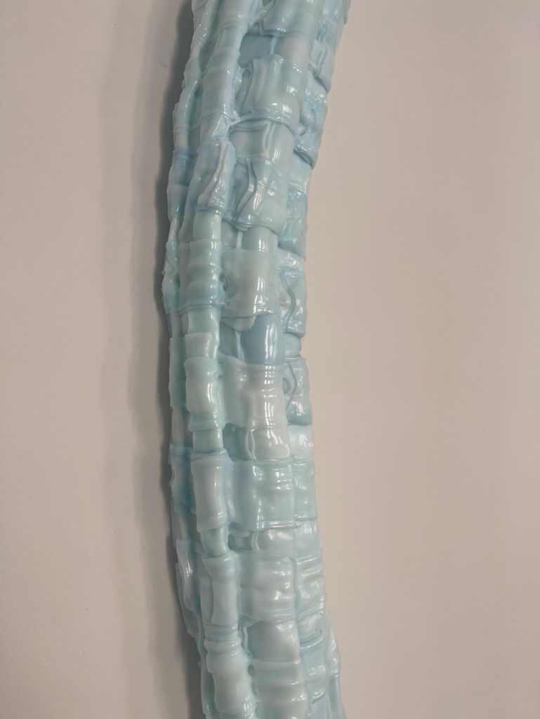 The lamp's impressive size was carefully chosen to represent the shocking fact that we buy 37 kg of plastic packaging, of which only 5.6 kg is recycled. The lamp consists of nine elements that have been fused together, and although the refrigeration elements have been joined, there are still visible traces of their original form. A special characteristic of the lamp is the bluish illumination created by the liquid in the refrigeration elements, providing it with a unique aesthetic that varies depending on whether the light is on or off.