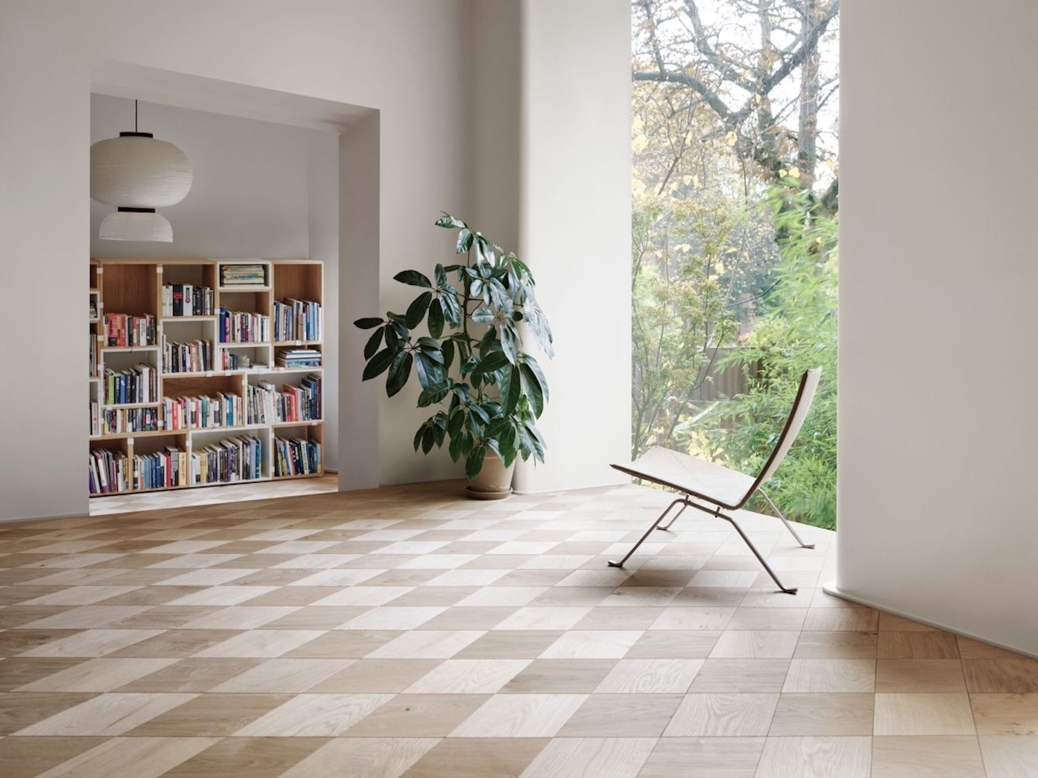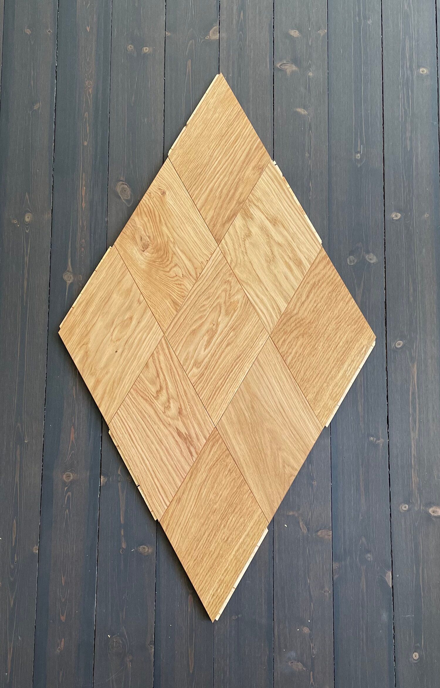 The offcuts are used for the flooring design called Rhombe, designed by the new duo Ecklon+Mortensen. Rhombe, as seen in the picture, is made from oak. It is highly innovative because the design allows for the use of the short offcuts in the daily production of traditional parquet and plank floors. This ensures that the wood at Wiking Floors is optimally utilized and does not go to waste.
