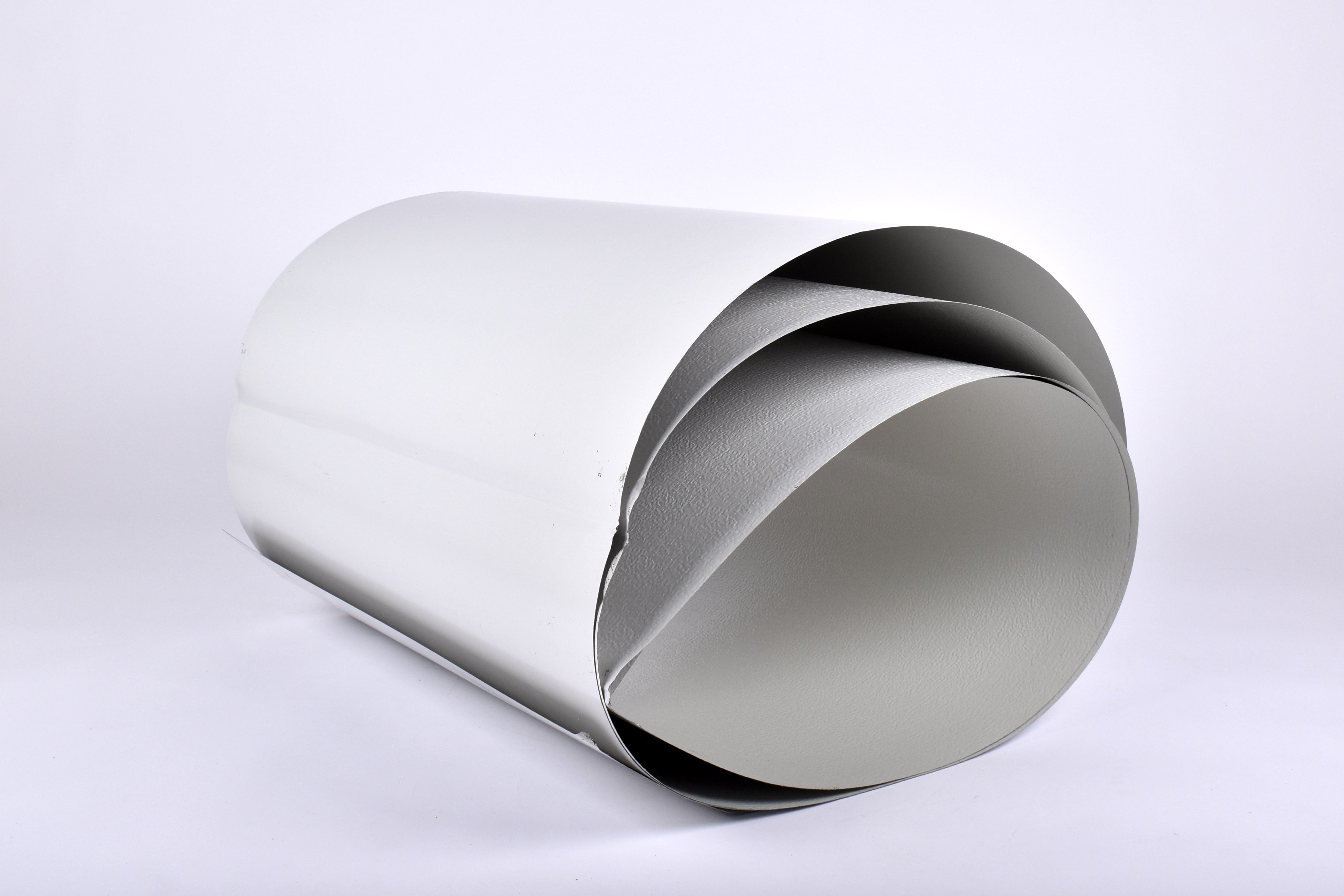 Offcut of sheet metal from the building industry. The sheet metal is grey and is made from coated steel. The surface of this material is smooth. Expect this material to be new.